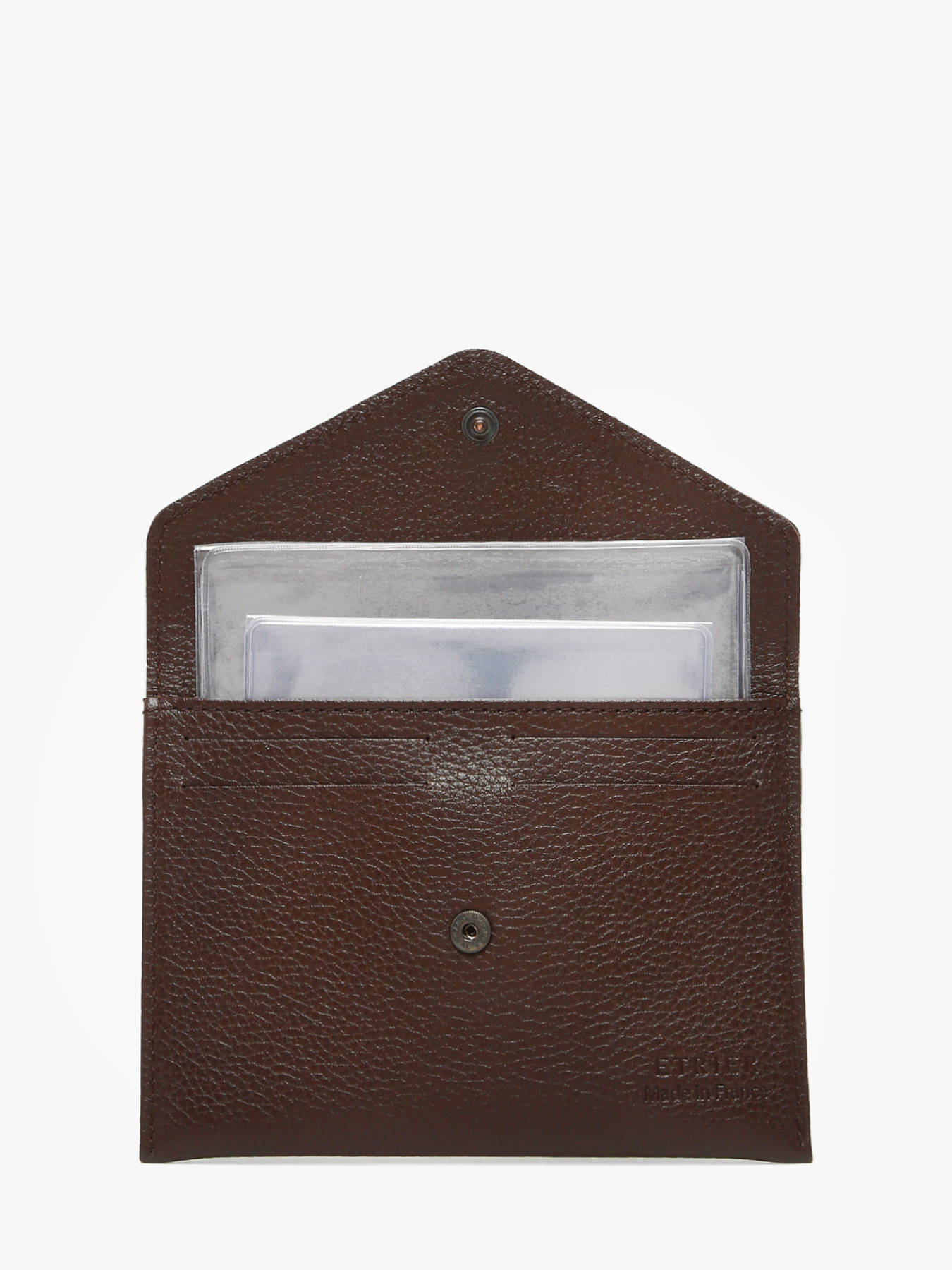 Ce porte-papier Madras par ETRIER, fabriqué en France en cuir véritable, s’ouvre en enveloppe pour dévoiler un intérieur aussi pratique qu’élégant. Il comprend deux protections plastiques adaptées aux formats de permis de conduire 8x11 cm et 9x13 cm. Deux fentes horizontales pour cartes sont également présentes, à gauche et à droite, pour un rangement optimal. En bas à droite, le logo ETRIER en métal et l’inscription Made in France embossée ton sur ton témoignent du savoir-faire maroquinier français.