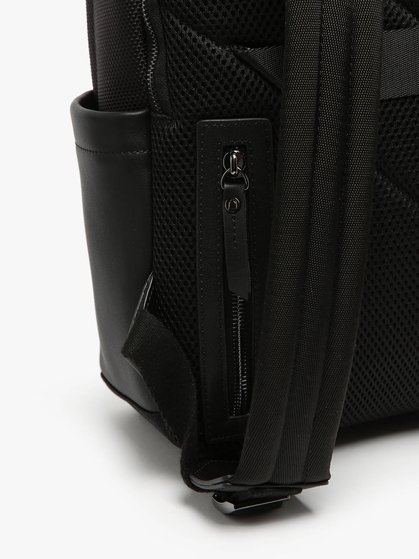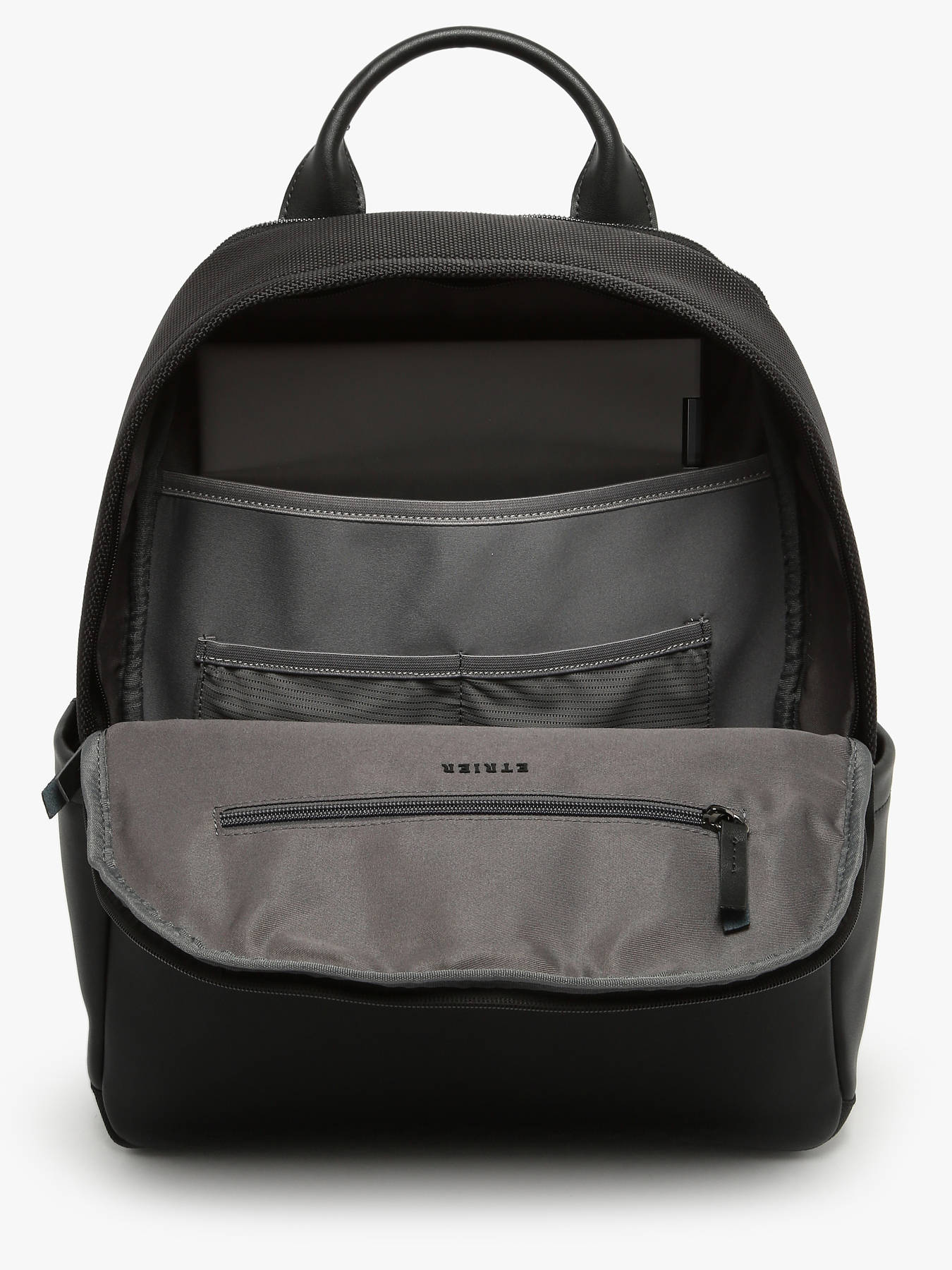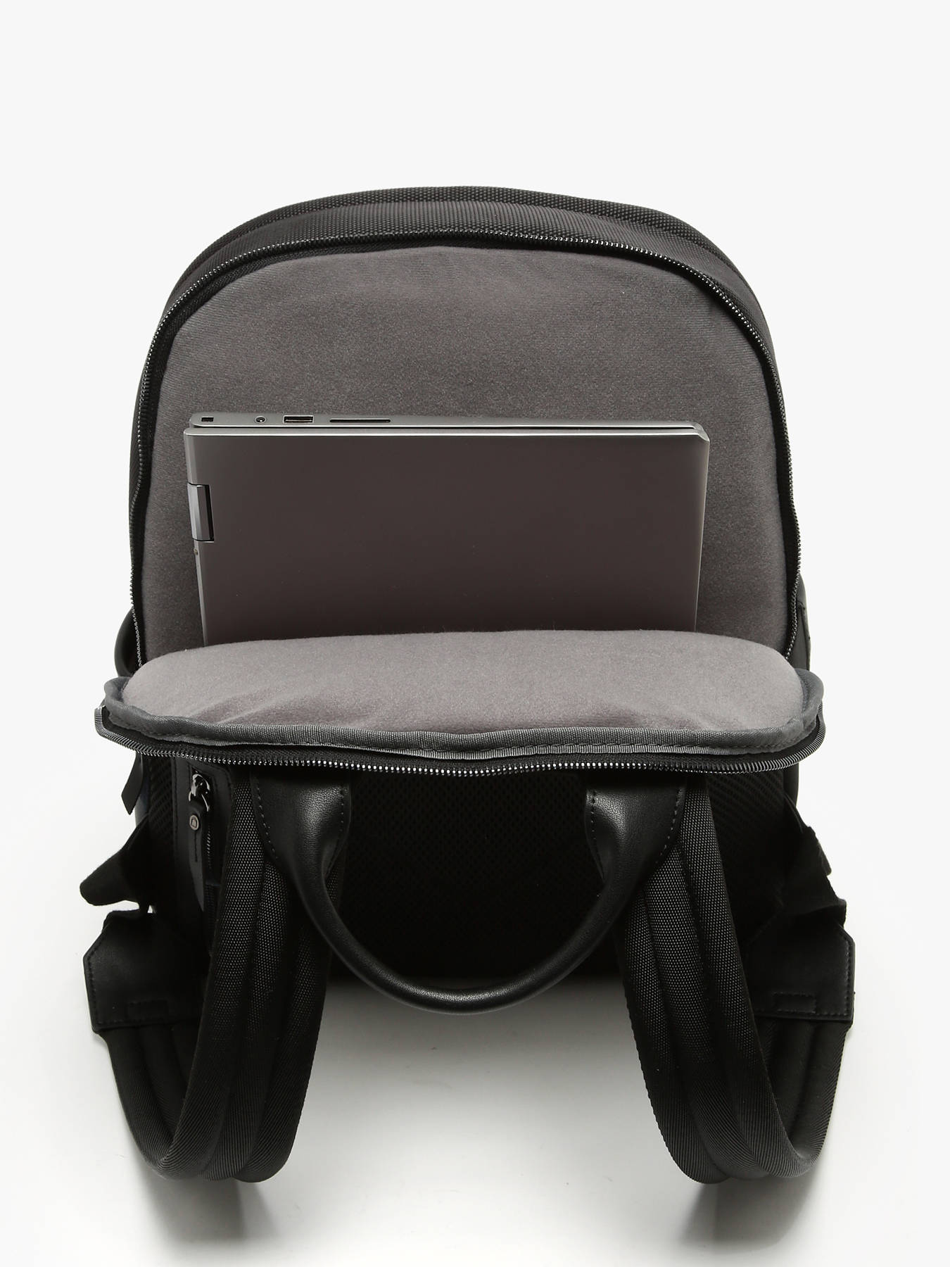 This business backpack from the Ruade line, made of a combination of leather split and polyester trim, blends durability with style. It features a telescopic handle pass-through, a front and back pocket, and two side pockets for practical storage. Inside, it is divided into two compartments, with three simple pockets, one quick-access pocket, and a reinforced compartment for a 15"" laptop.
