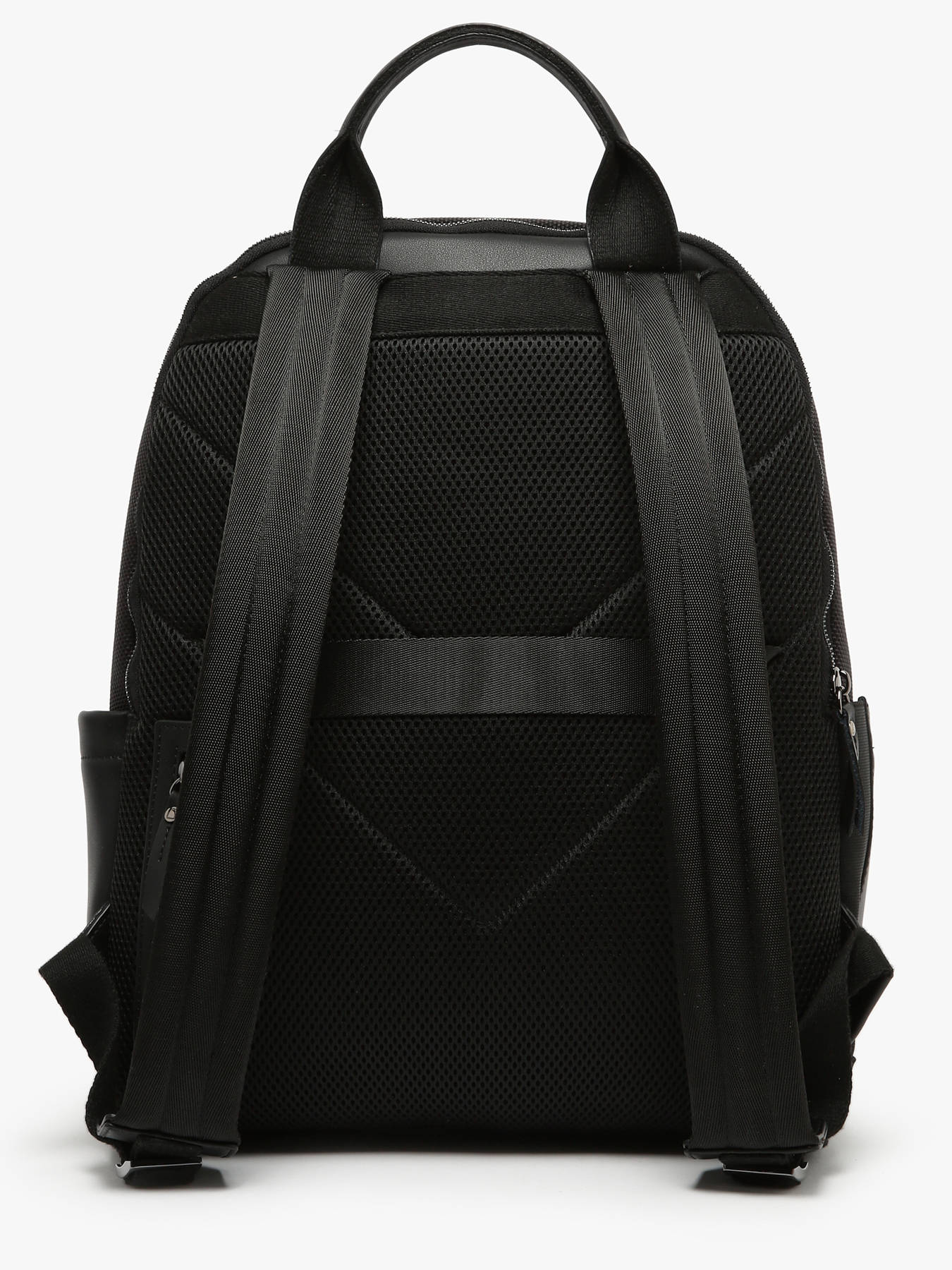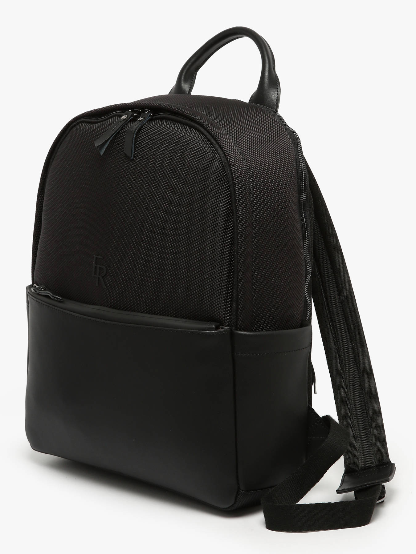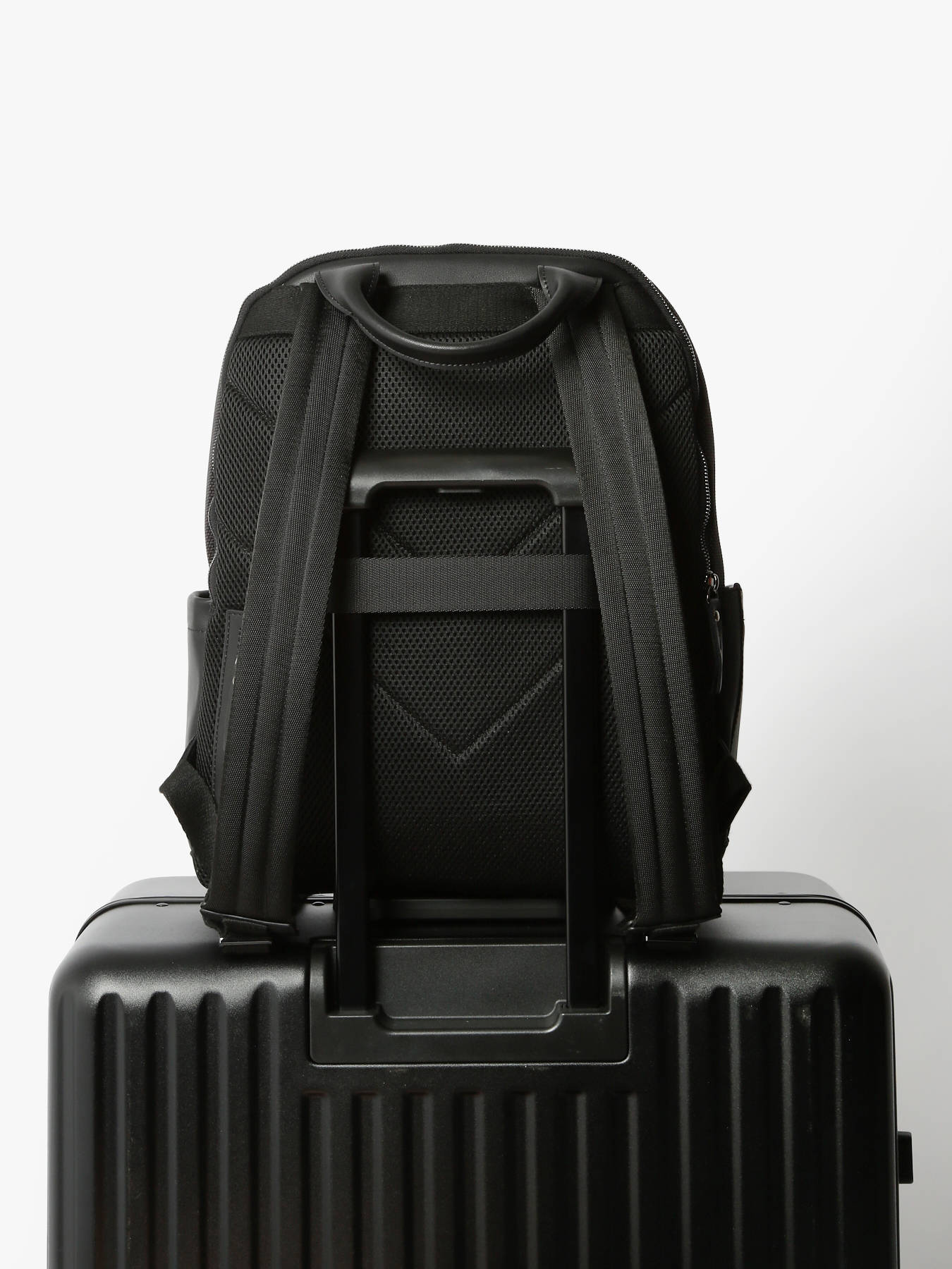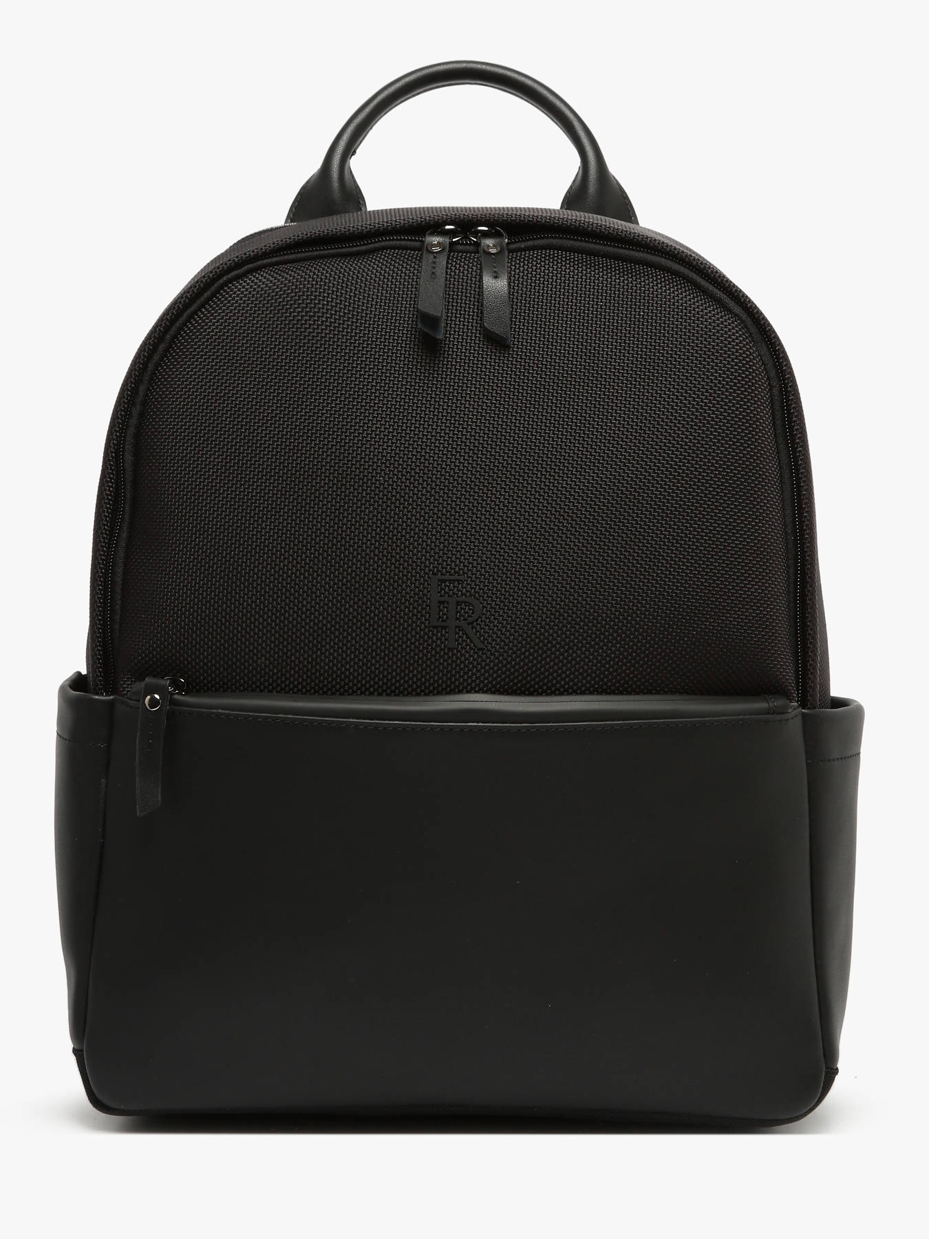 This business backpack from the Ruade line, made of a combination of leather split and polyester trim, blends durability with style. It features a telescopic handle pass-through, a front and back pocket, and two side pockets for practical storage. Inside, it is divided into two compartments, with three simple pockets, one quick-access pocket, and a reinforced compartment for a 15"" laptop.