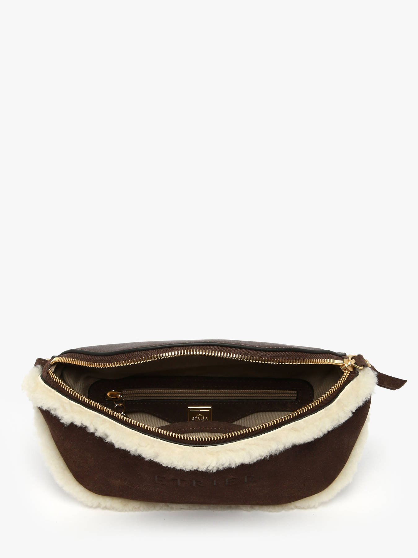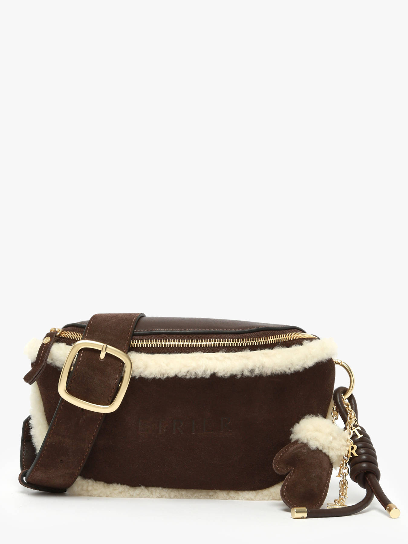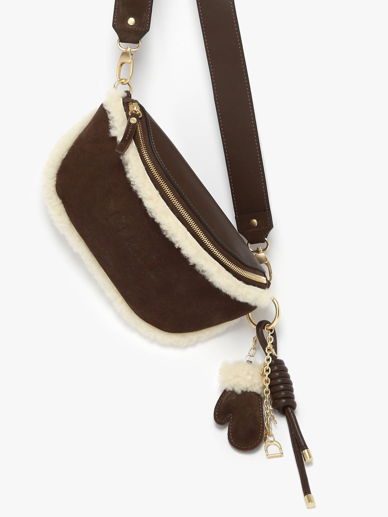 The ETRIER belt bag from the ALPIN line is crafted from cowhide suede leather, with a smooth leather back for added durability. It closes with a secure zip, making it ideal for everyday use. Inside, it features a slip pocket and a zip pocket to help you keep your essentials organized. The bag is adorned with a charm keyring showcasing the iconic symbols of the ALPIN line: a mitten, a stirrup, and the letters ETRIER, all highlighted with a shearling trim for a cozy touch. Its adjustable and removable strap allows for versatile wear — at the waist, across the body, or over the shoulder. A functional yet stylish piece with bold alpine character.
