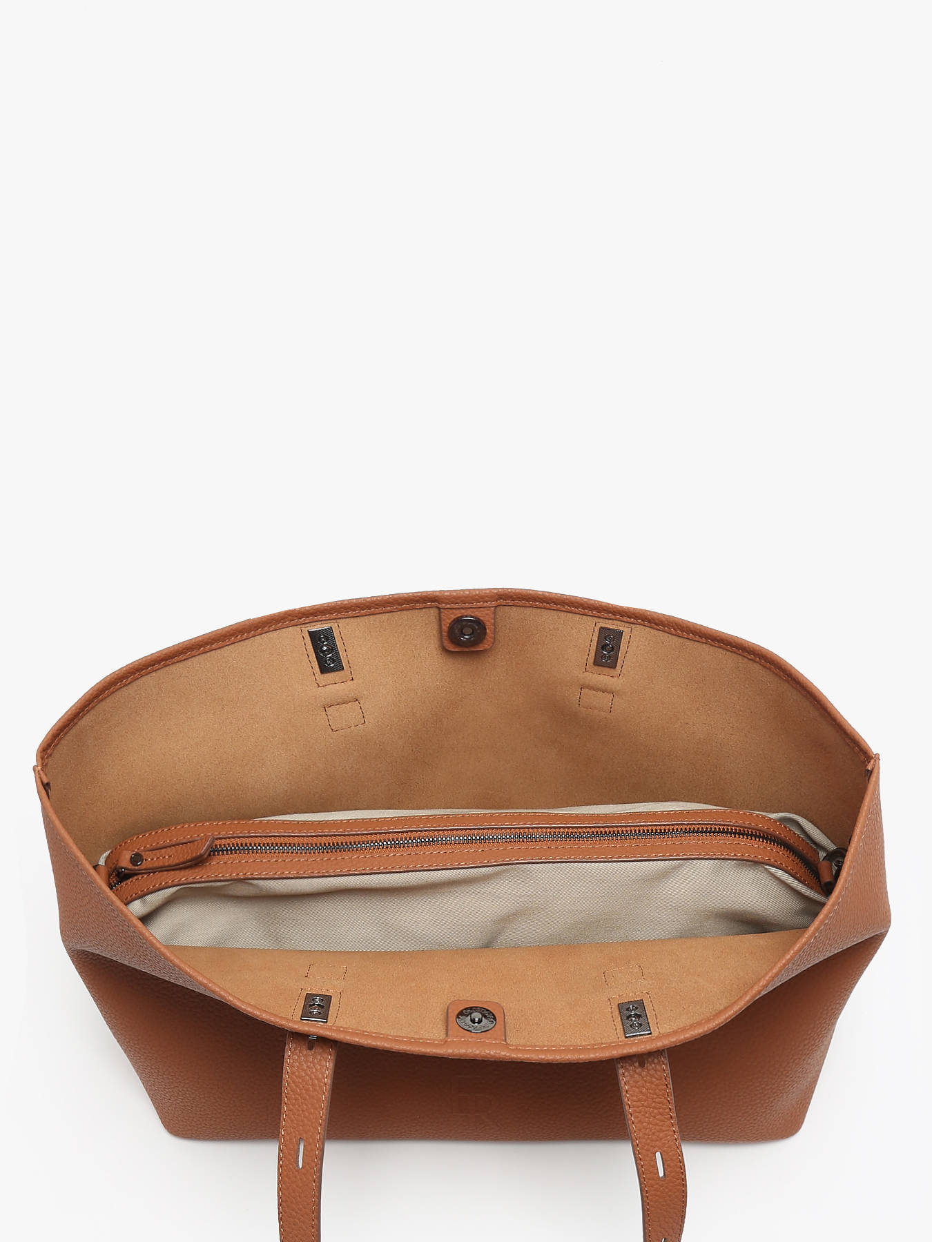 The CAVALIER tote bag by ETRIER is made from grained full-grain cowhide, offering both sturdiness and elegance. Its handles are adjustable thanks to a clever little detail, so you can customise the way you hold it. The bag closes securely with a magnetic snap, and its interior features a large detachable cotton pouch, ideal for protecting and organising your belongings. The modern logo, embossed on the leather, features the ETRIER letters for a discreet touch of sophistication. With its generous space, the bag can also carry A4 documents, combining practicality and style. A spacious, refined bag that's the perfect elegant accompaniment to your everyday life.